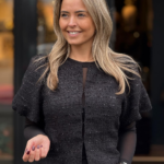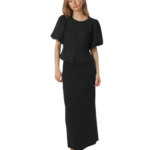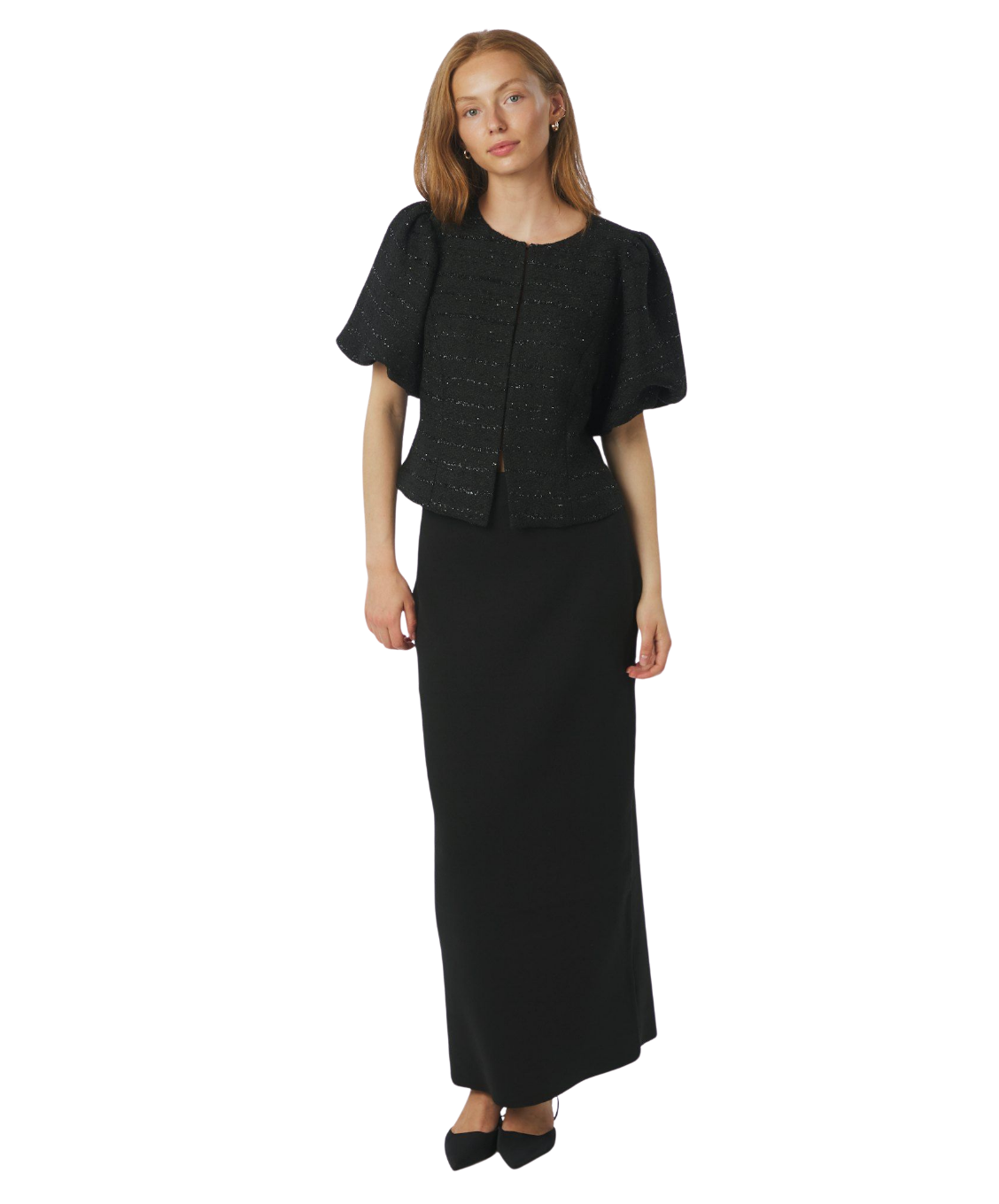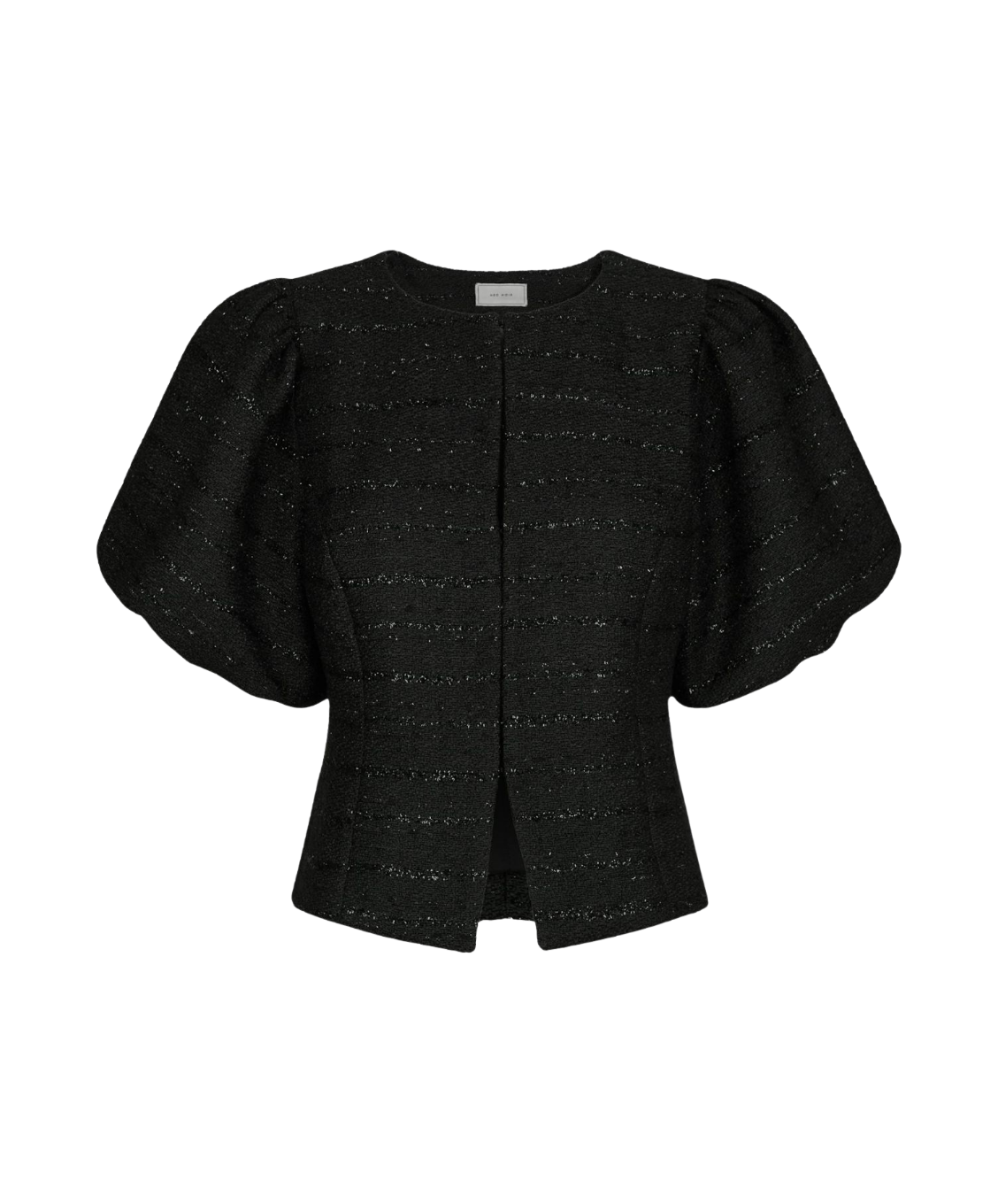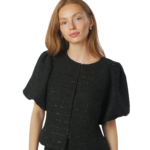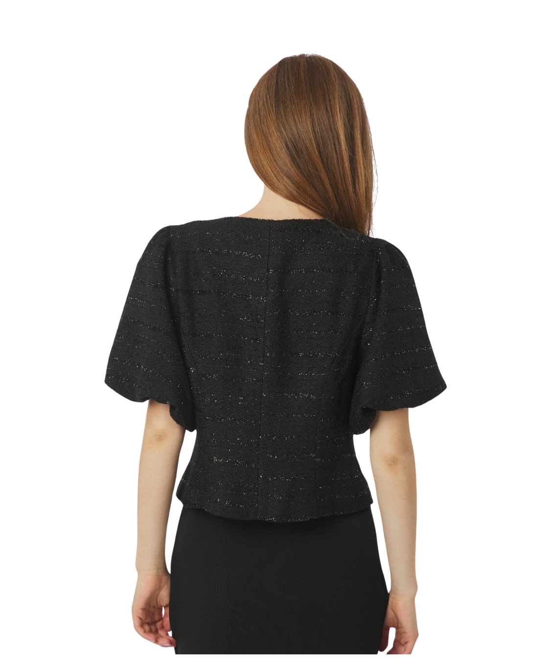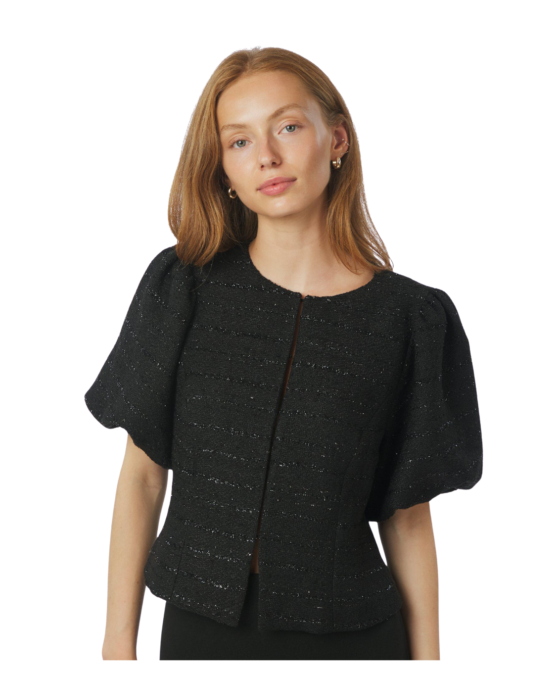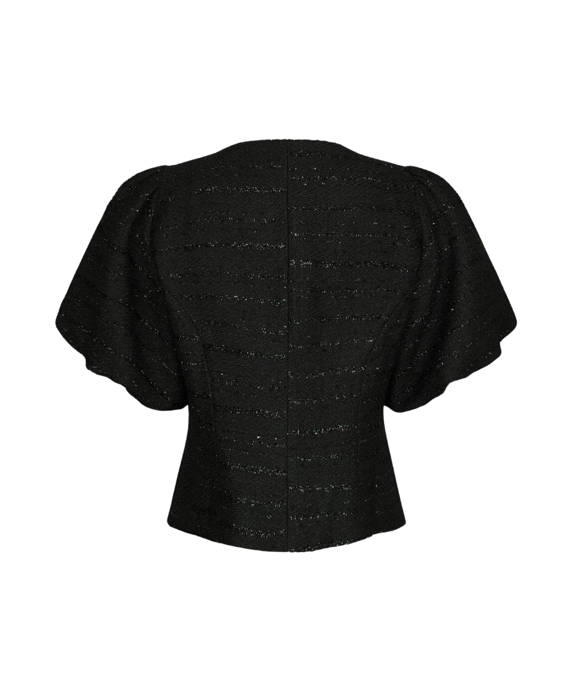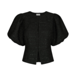 Elegante blouse in bouclékwaliteit met een subtiel shimmer effect. De top heeft pofmouwen, een knoopsluiting aan de voorkant en een getailleerde pasvorm die de vrouwelijke shape mooi benadrukt. Perfect voor een feestelijke look of om je winteroutfit extra luxe te geven.