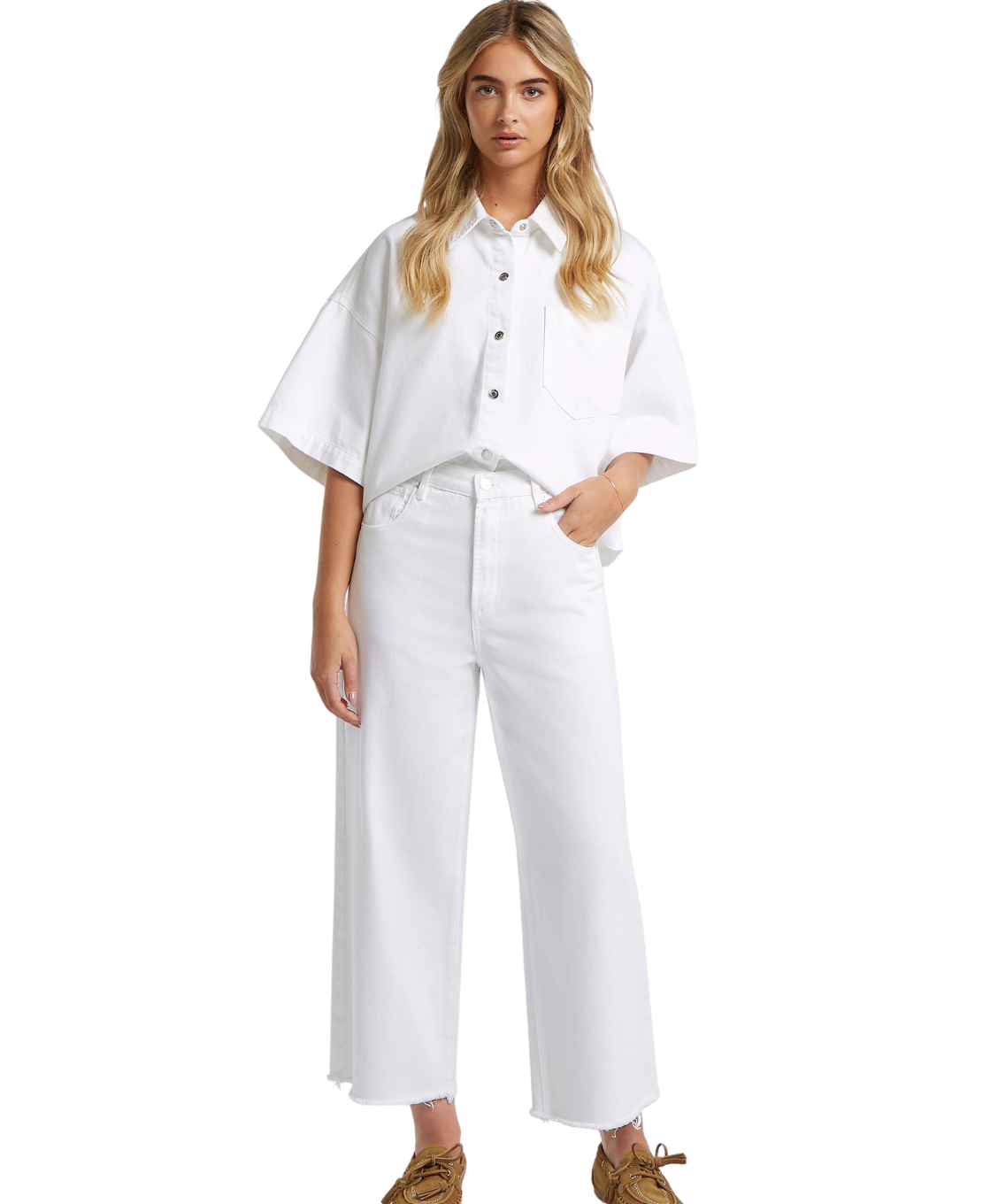 Wijde cropped dames jeans met een middelhoge taille gemaakt van stretch denim. De Boston is uitgevoerd in een witte wassing en heeft gerafelde broekspijpen. Beschikbaar in meerdere wassingen. Op de beelden zie je ook de Denver blouse fresh white.