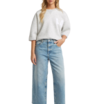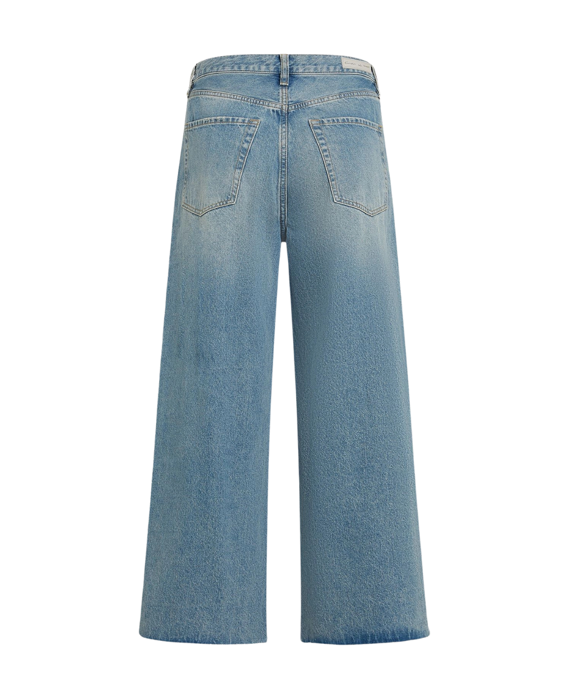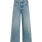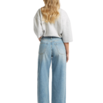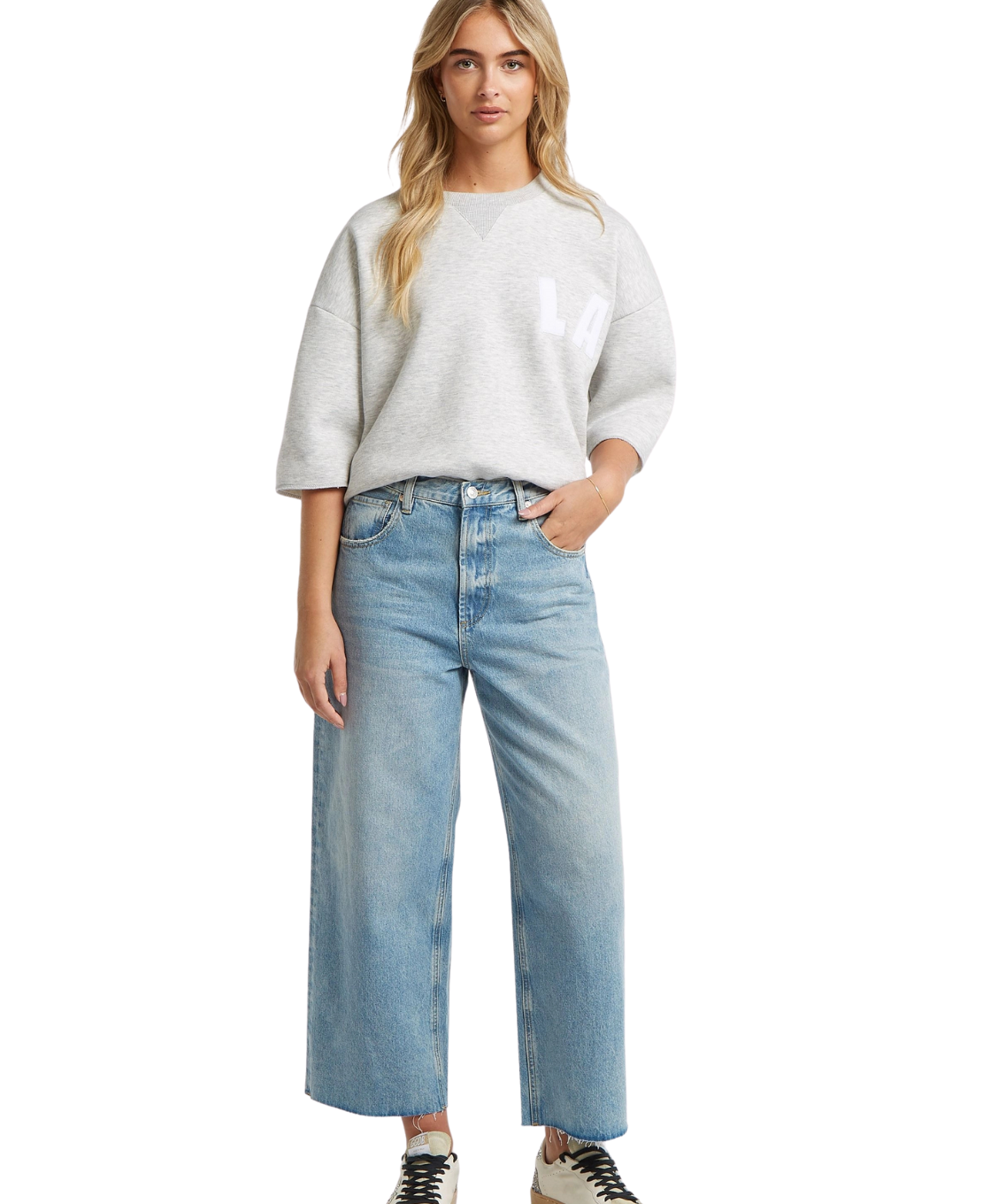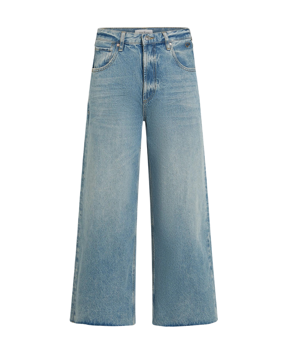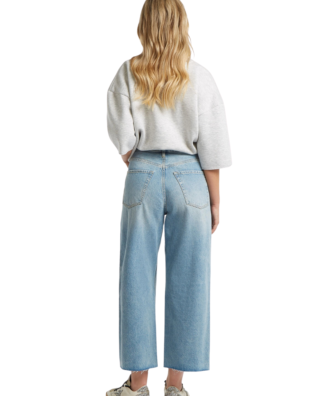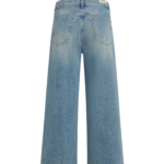 Wijde cropped dames jeans met een middelhoge taille gemaakt van stretch denim. De Boston is uitgevoerd in een lichtblauwe wassing en heeft gerafelde broekspijpen.