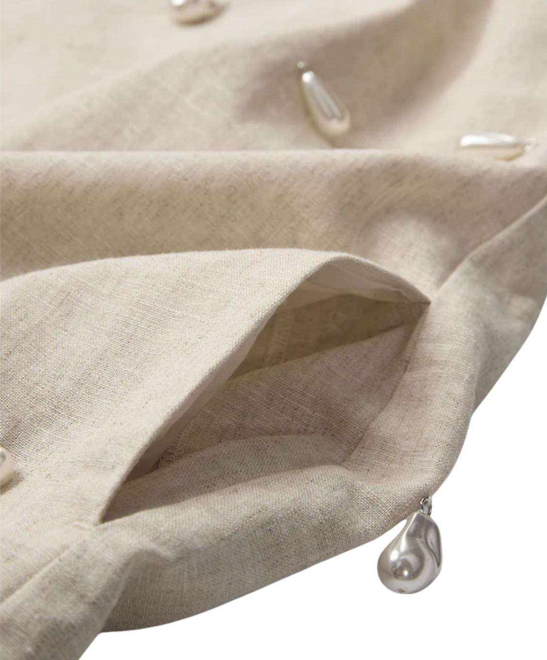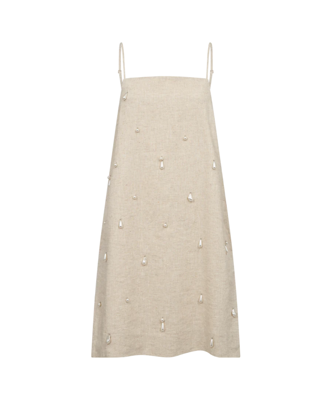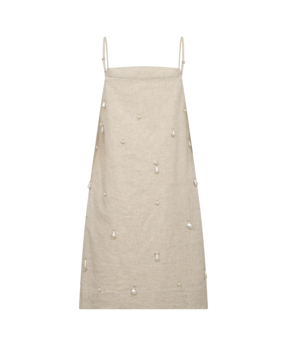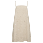 De rechte halslijn en smalle, verstelbare bandjes zorgen voor een minimalistisch silhouet, terwijl subtiele coupenaden de pasvorm mooi laten aansluiten. De speels geplaatste, druppelvormige parelapplicaties geven de jurk een luxe en sculpturaal effect. Volledig gevoerd en voorzien van handige steekzakken voor een nette afwerking. Draag met hakken voor een chique look of met sandalen voor een zomerse uitstraling.