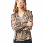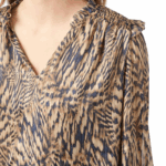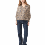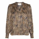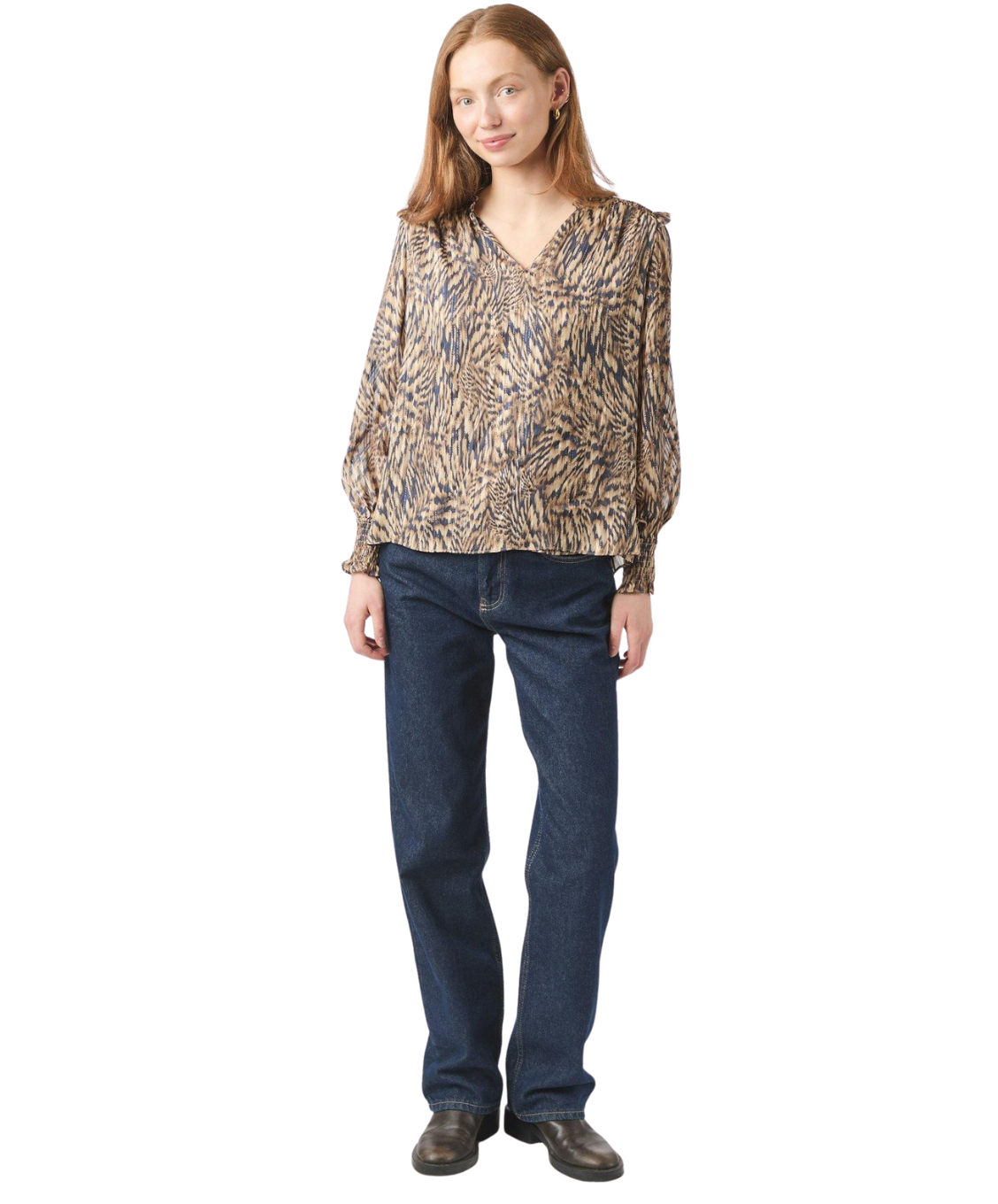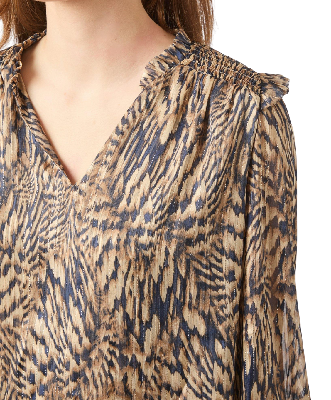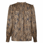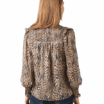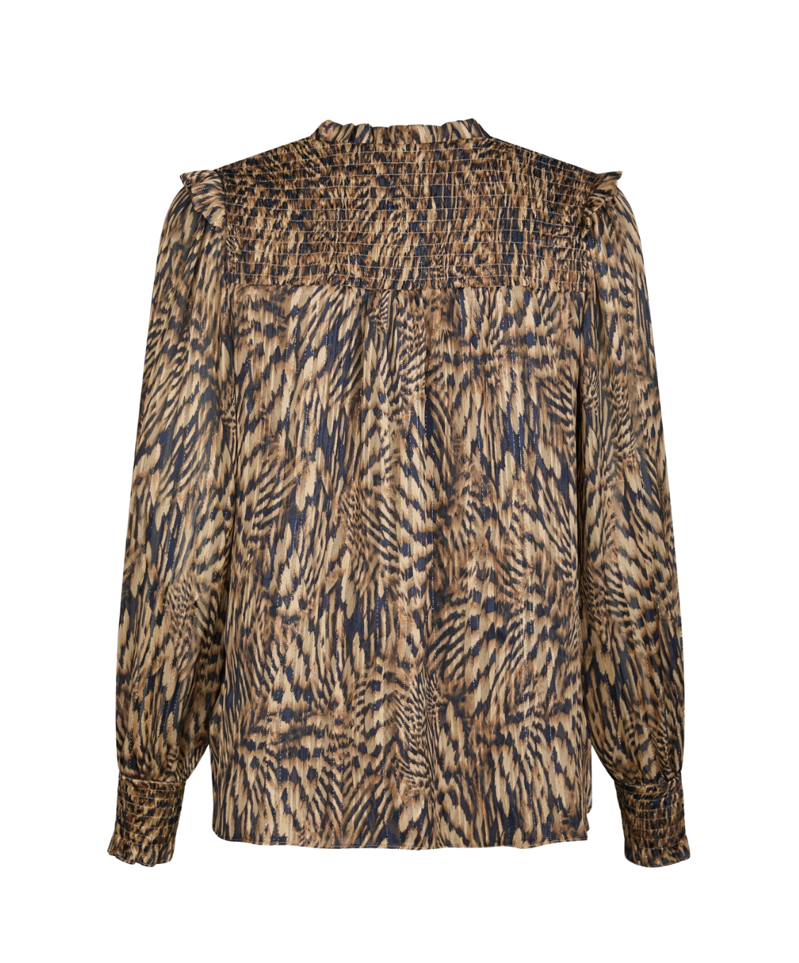 Elegante blouse met smockdetails op de schouders en manchetten. Afgewerkt met subtiele ruches langs de schouders en hals, uitgevoerd in een stijlvolle print. Perfect om zowel casual als chic te dragen.