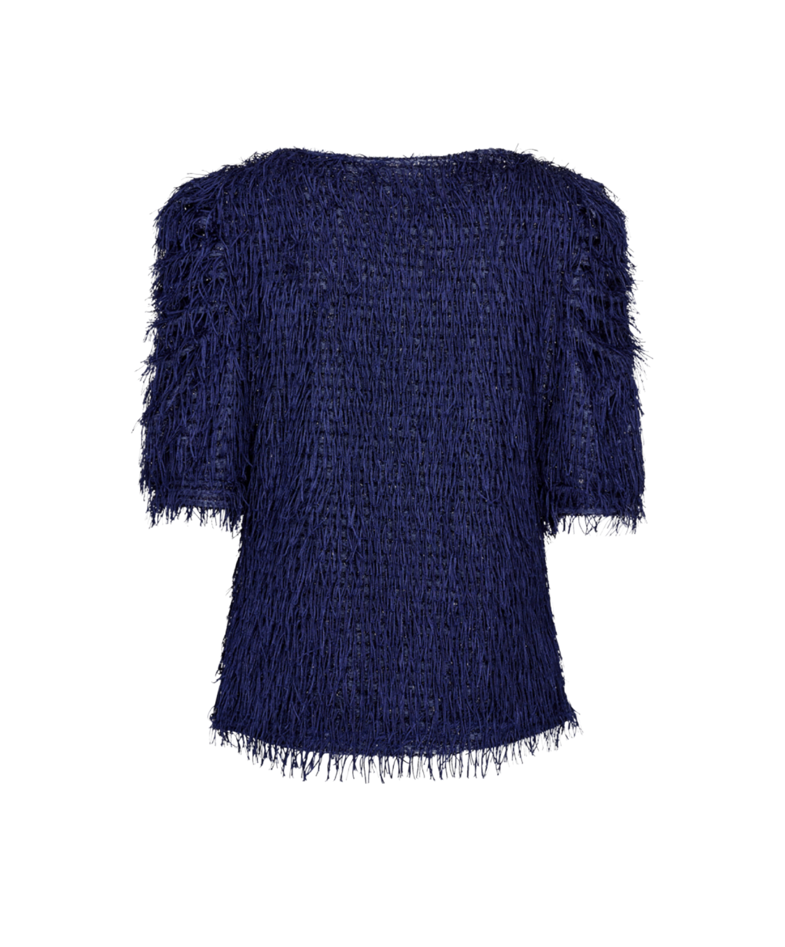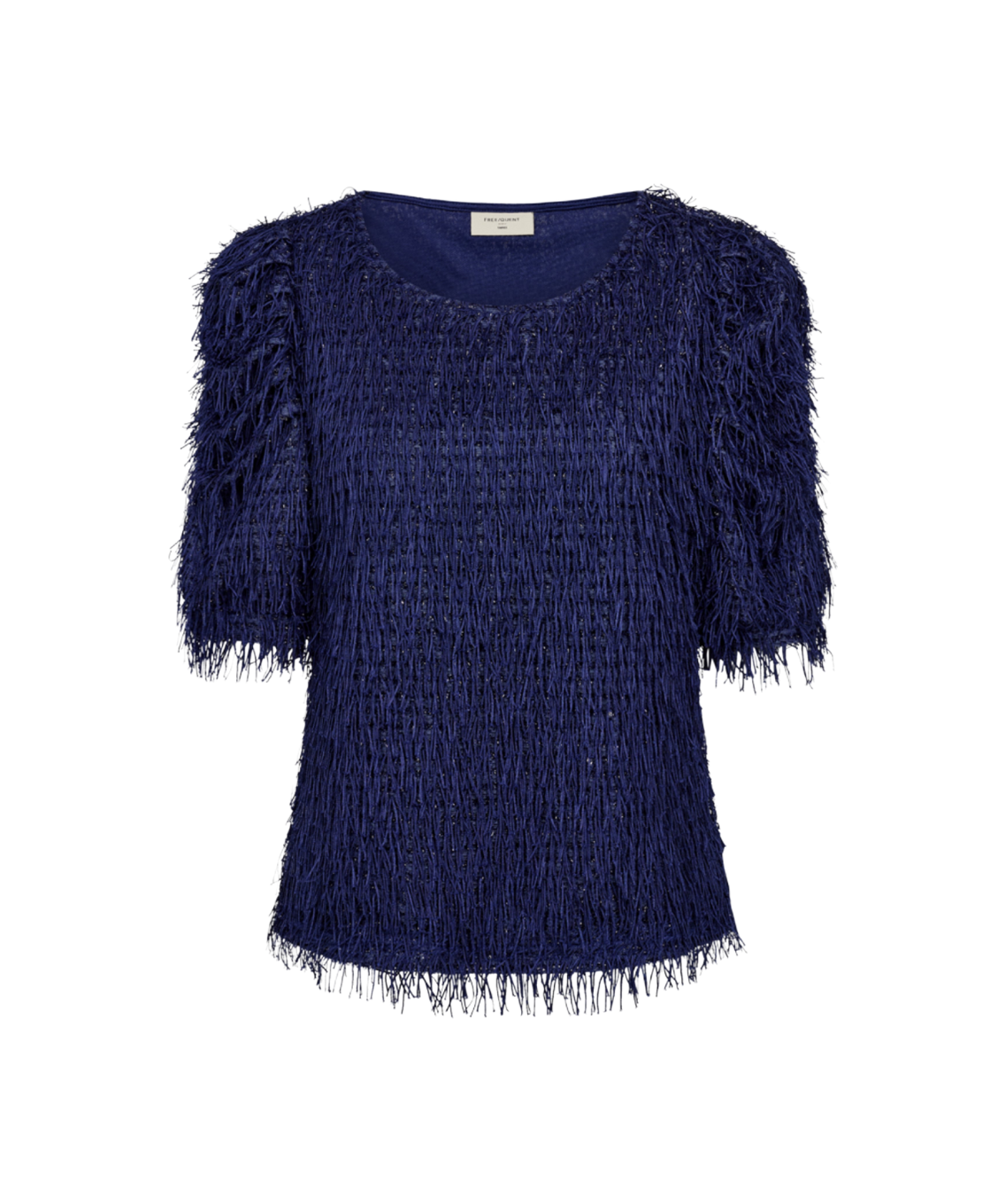 De Fqmarlin Fringe top van Freequent is een elegante top met opvallende franjes en subtiele glans. De luchtige stof en pofmouwen zorgen voor een moderne, feestelijke uitstraling. Perfect voor een stijlvolle avondlook.