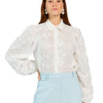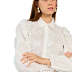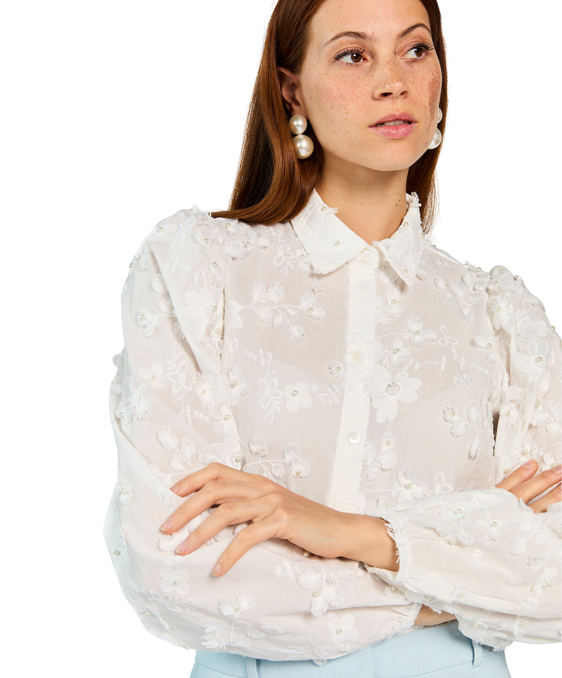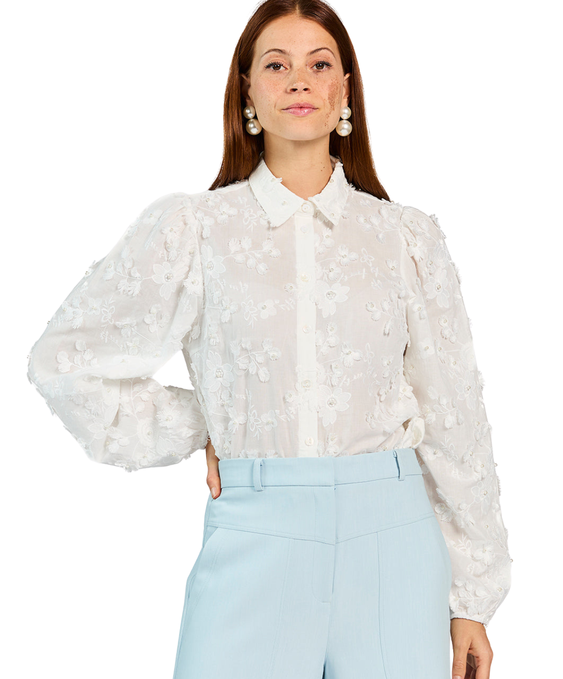 De Lien blouse is een echte eyecatcher met een subtiele, vrouwelijke uitstraling. Gemaakt van 100% organisch katoen en verrijkt met prachtige bloemenapplicaties met kleine beads voor een luxe detail. De semi-transparante stof en elegante pofmouwen geven de blouse een verfijnd en romantisch karakter. Dankzij de rechte fit en klassieke kraag is dit een veelzijdig item dat je moeiteloos draagt naar zowel een bijzondere gelegenheid als een stijlvolle everyday look.