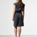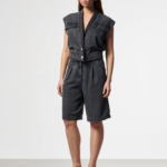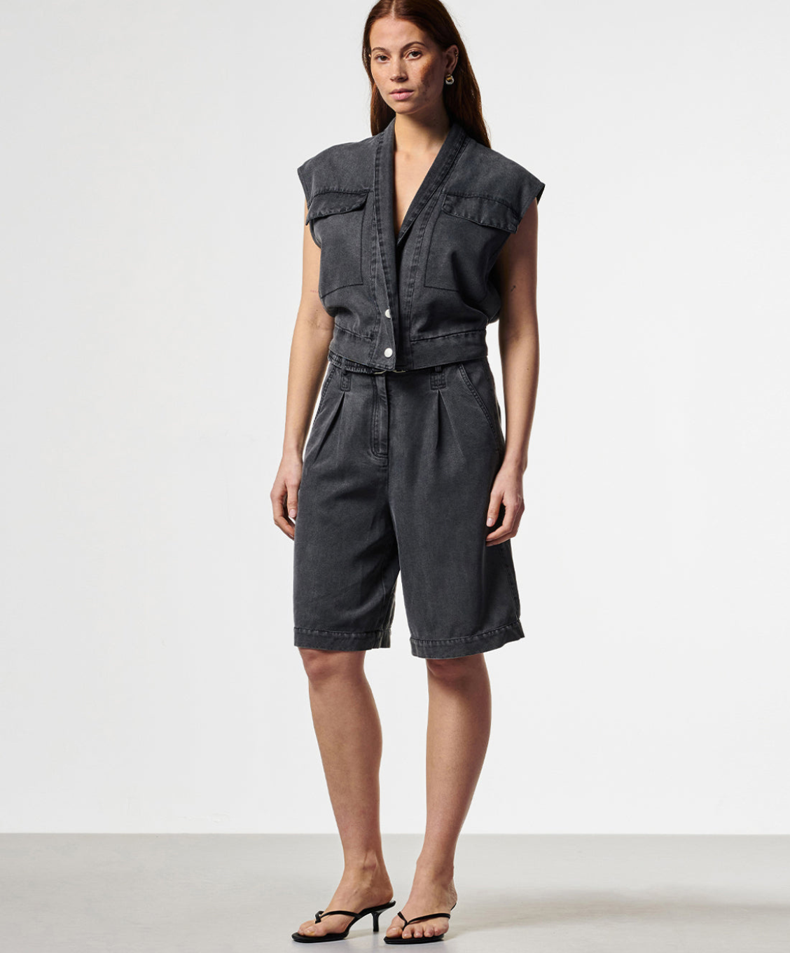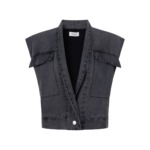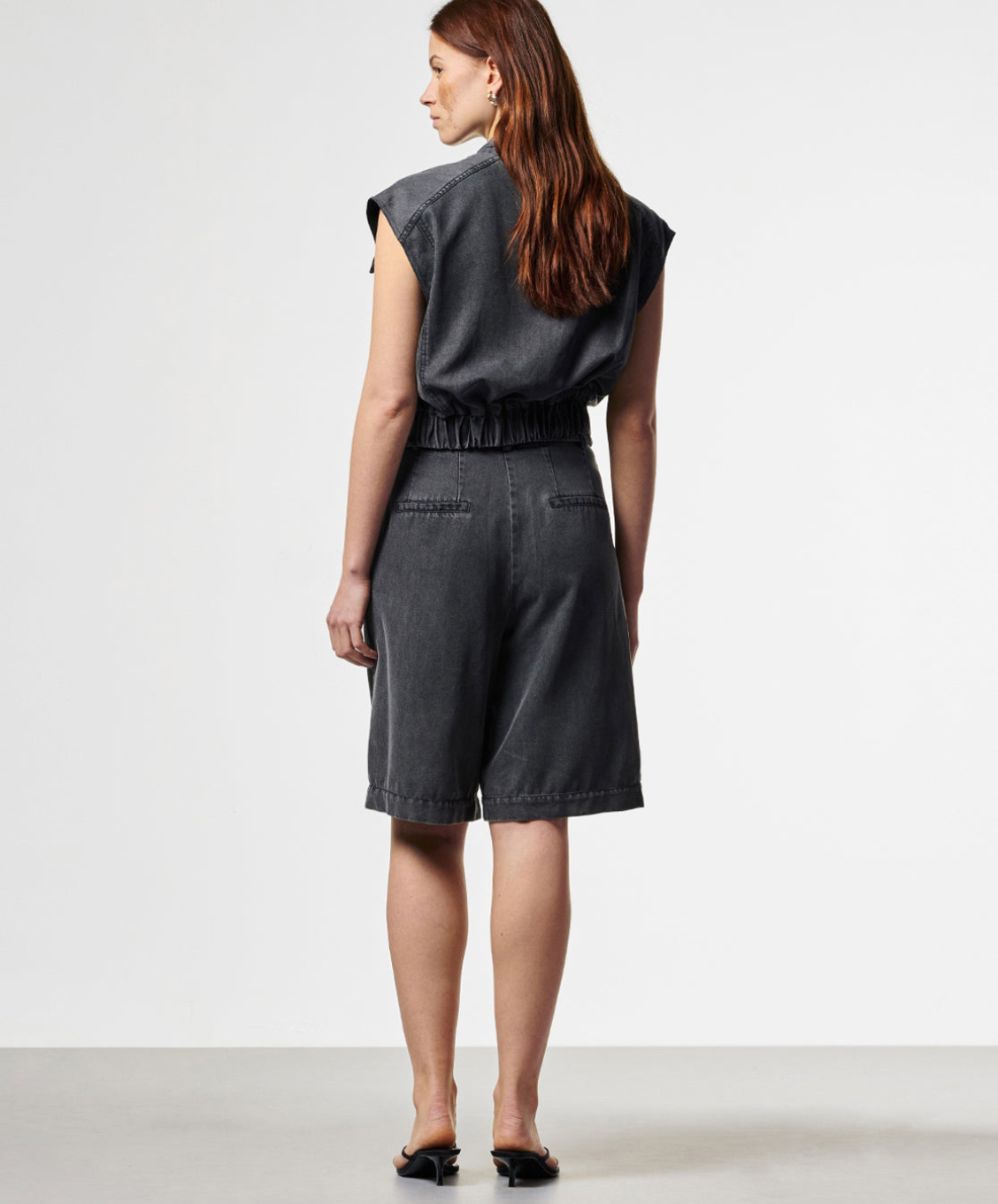 Deze top heeft een stoere en moderne uitstraling. Het denimlook materiaal in combinatie met de diepe V-hals en de opvallende schouderdetails geeft het item een krachtige en eigentijdse look.