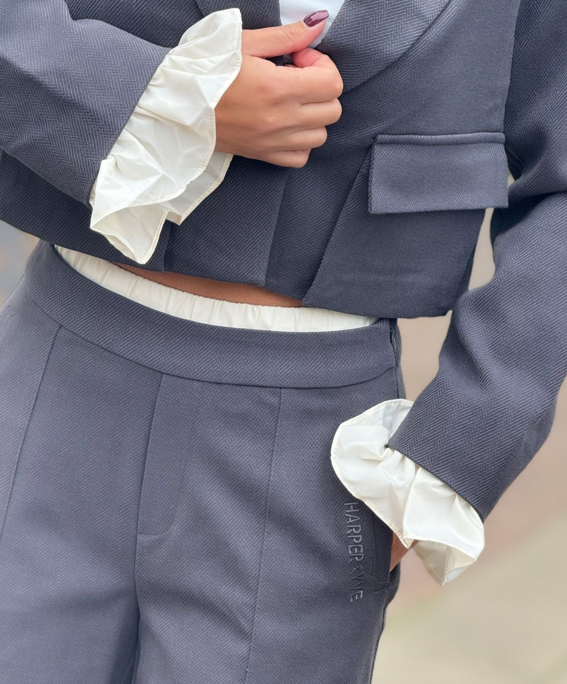De LILIAN pants in grijs combineren stijl en comfort. Dankzij de wolblend voelen ze luxe aan, terwijl de rechte fit en lichte stretch een perfecte pasvorm creëren. De witte tailleband geeft een speels effect toe aan de broek. Ideaal voor werk of avond. Combineer samen met de IVY blazer.