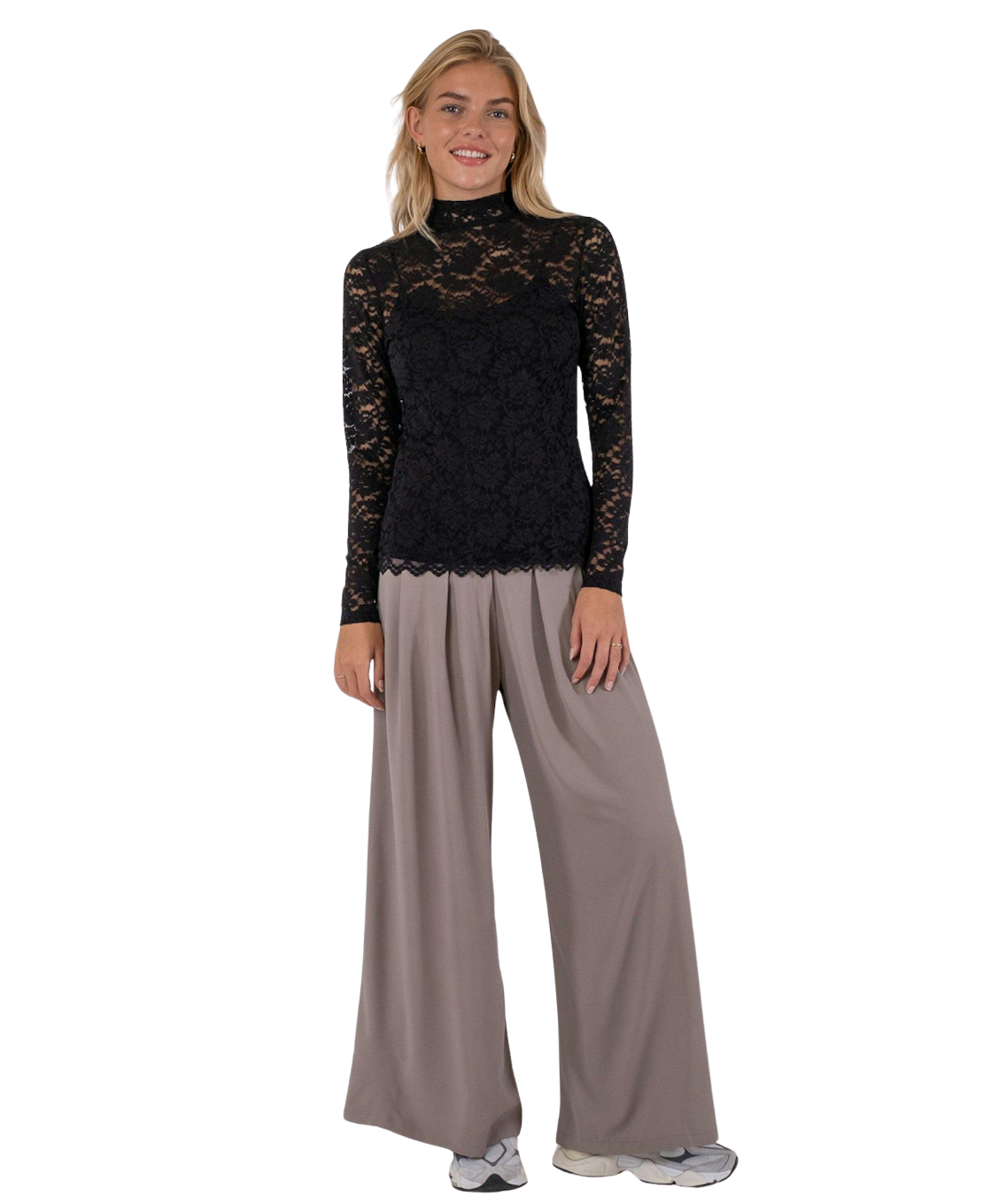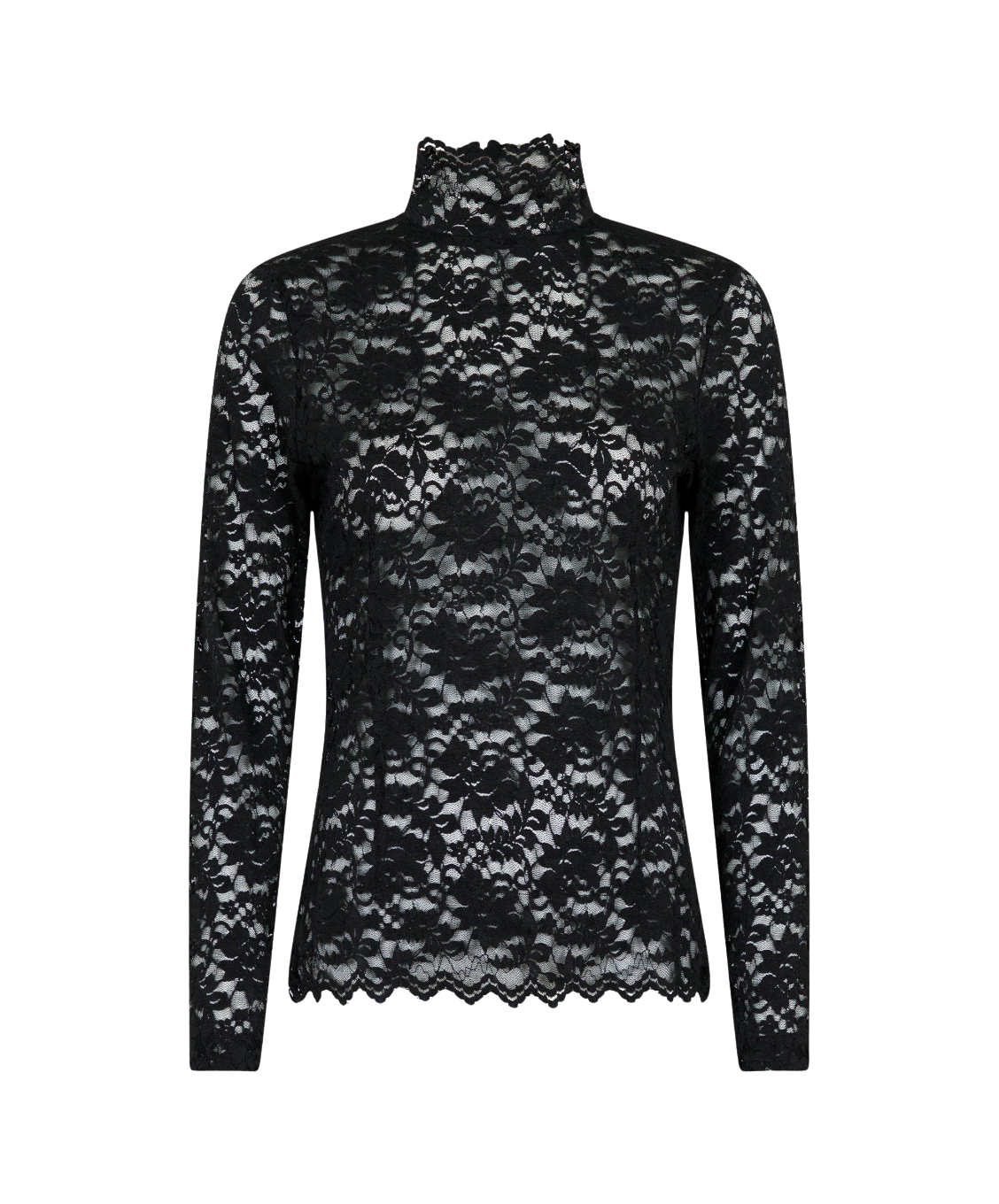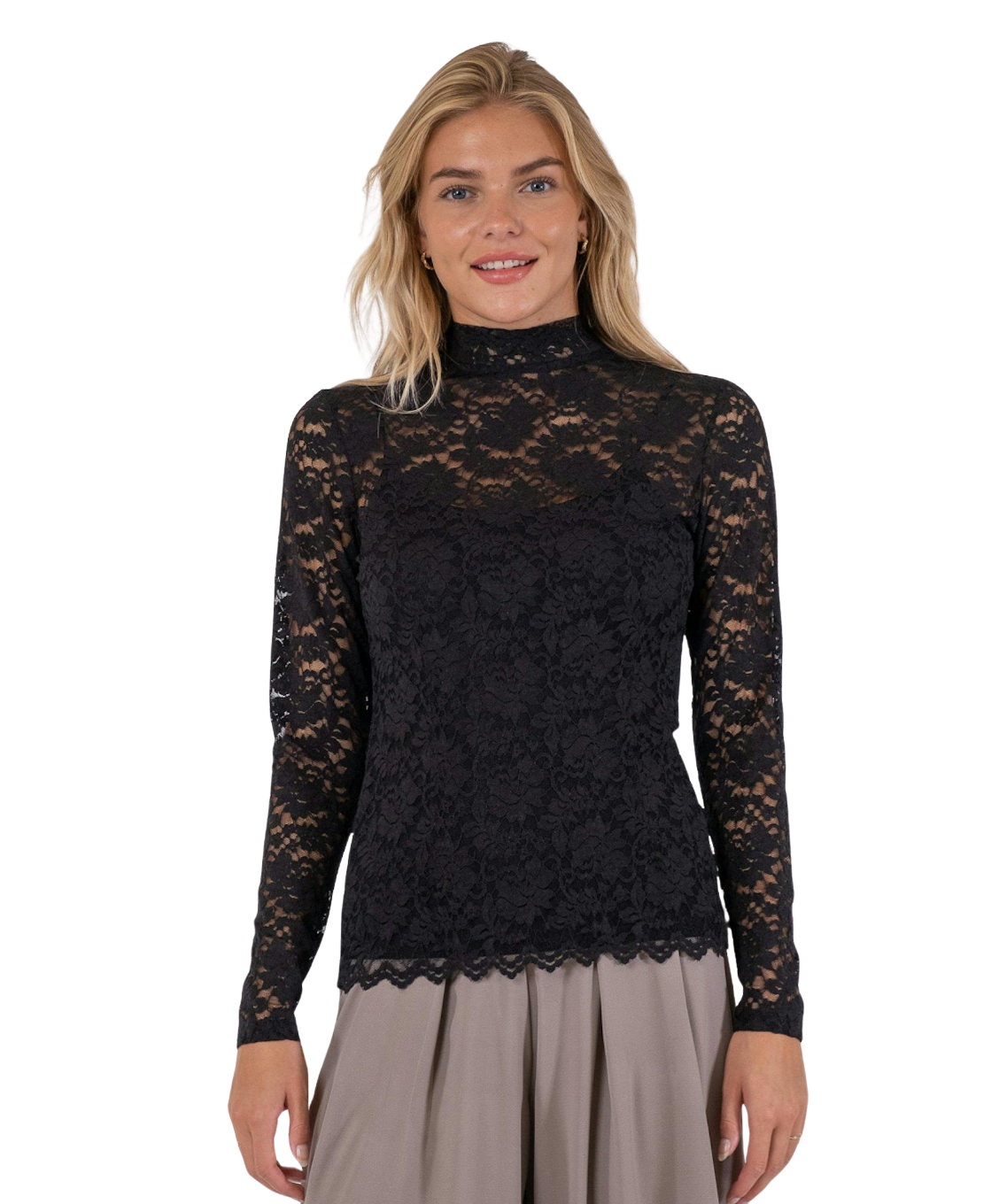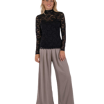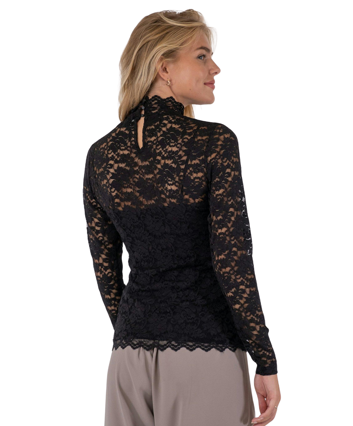 Elegante blouse in stretch kant met een colletje en knopen aan de achterkant van de hals. Het model is slim fit maar comfortabel, gemaakt van zachte, rekbare kant. Perfect om los te dragen of onder een trui of blazer voor een verfijnde look.