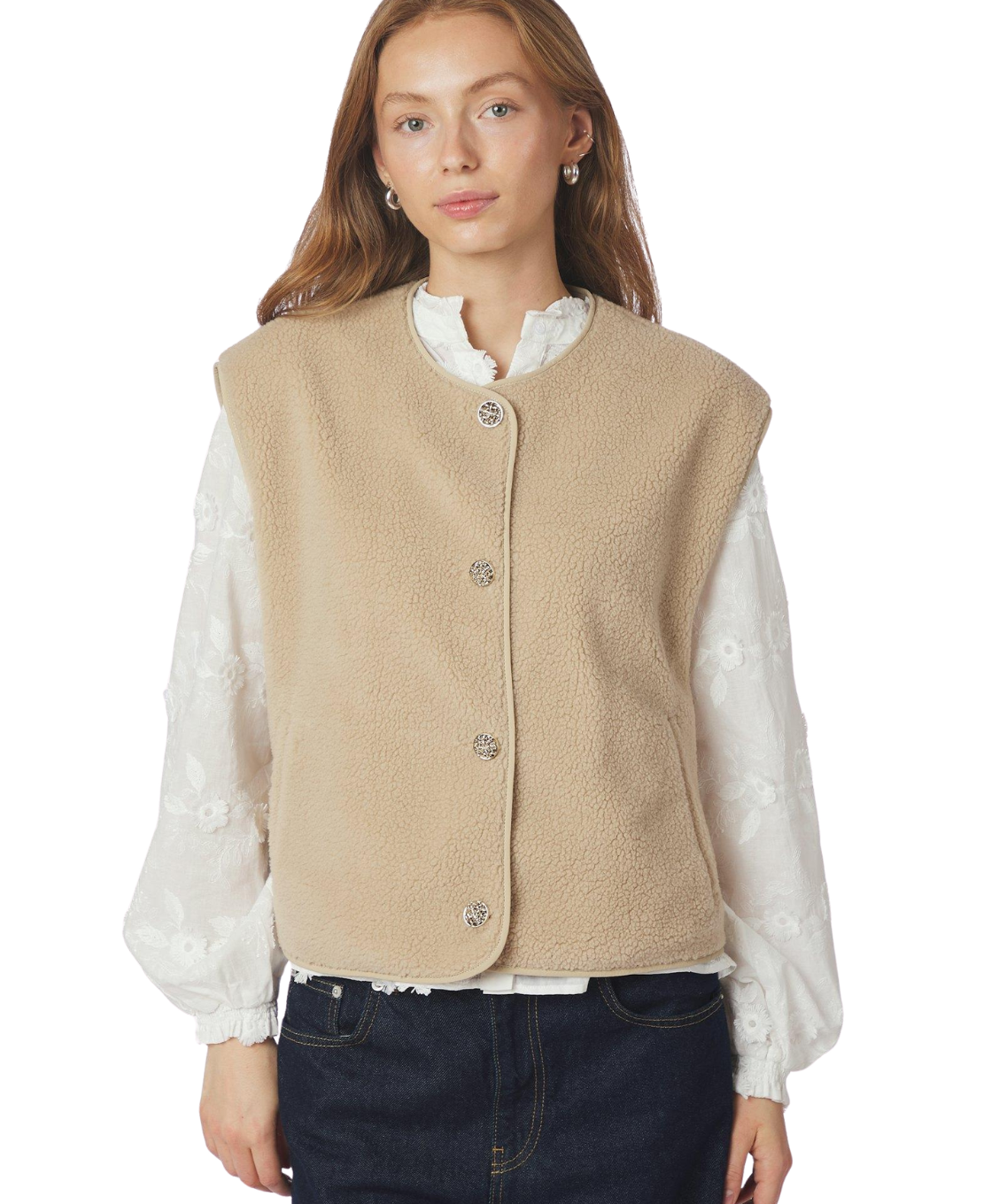 Dit teddy gilet combineert comfort met een elegante uitstraling. De zachte, fluffy kwaliteit voelt heerlijk warm aan, terwijl de gouden knopen zorgen voor een luxe en vrouwelijke touch. Perfect om te dragen als jasje in het voorjaar of als extra laagje op frissere dagen.