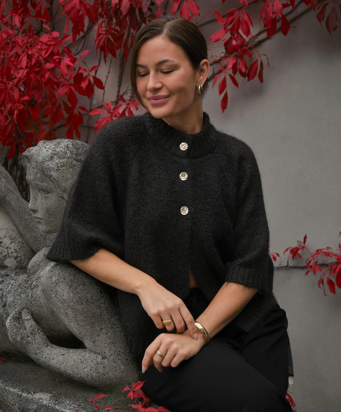 Zachte gebreide blouse met een kleine col en verlaagde schoudernaden voor een relaxte, moderne uitstraling. De boxy fit zorgt voor een comfortabele pasvorm, ideaal voor laagjes in het najaar. Uitgevoerd in een diepe wijnrode kleur voor een warme, stijlvolle look.