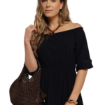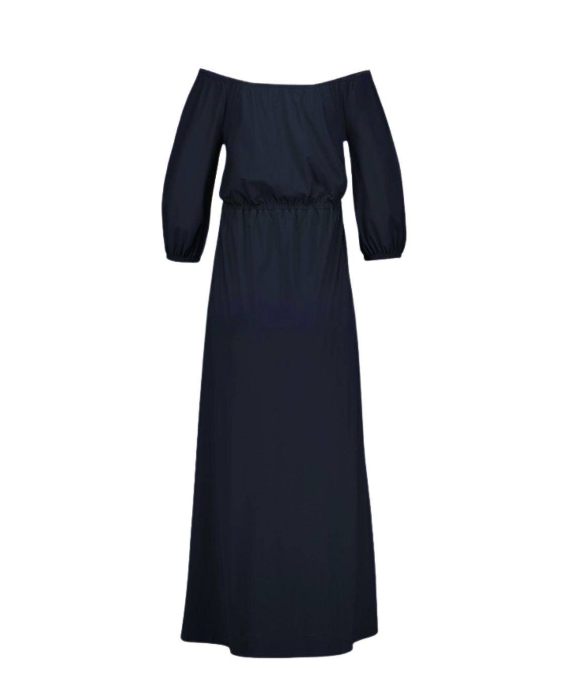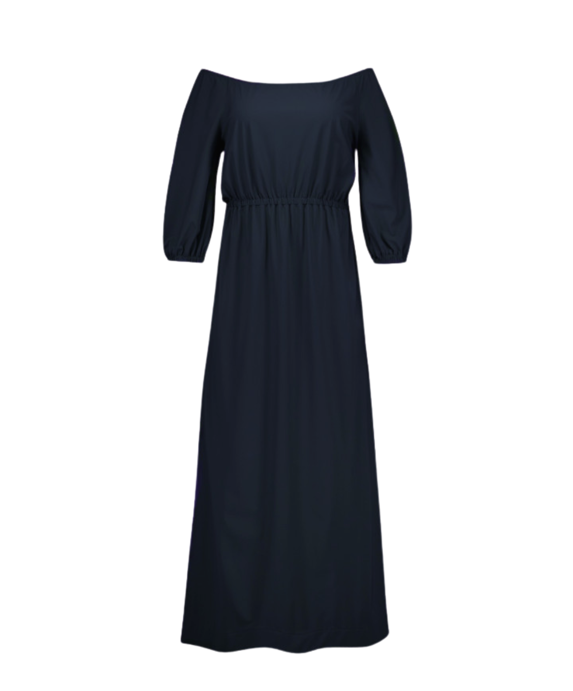 De Saturday dress van Studio Anneloes is een vrouwelijke midi jurk in de kleur Dark Blue. De soepele Medium Travelstof, elastische details en het off-the-shoulder model geven dit item een elegante en tegelijkertijd comfortabele uitstraling, perfect voor zowel casual als meer geklede momenten.