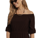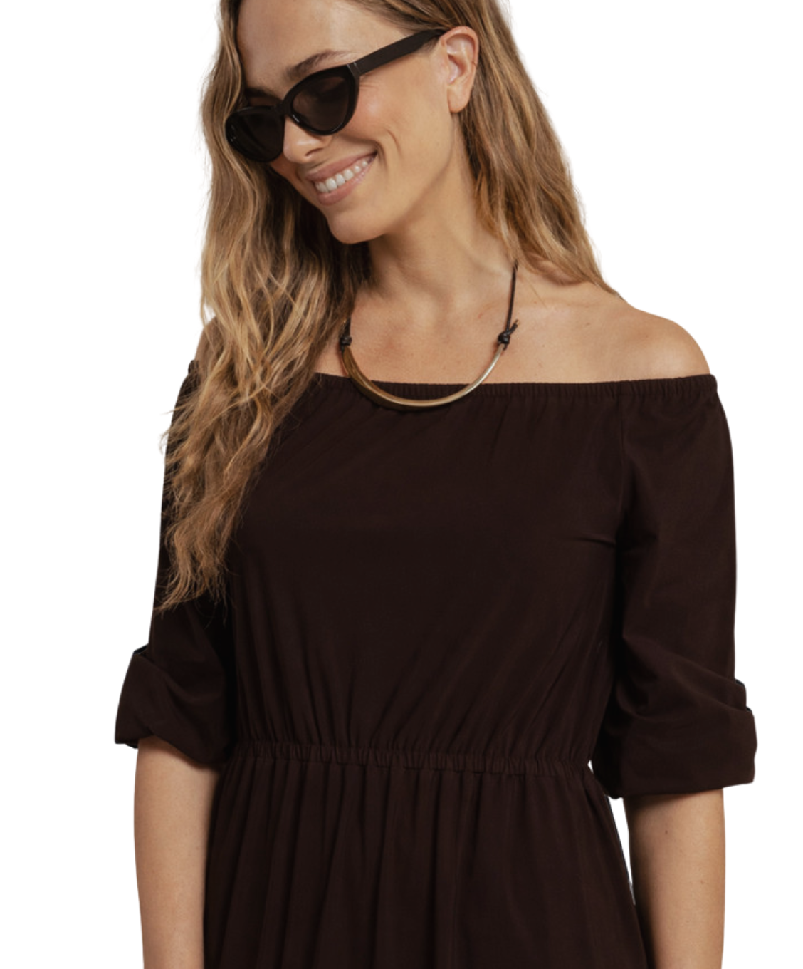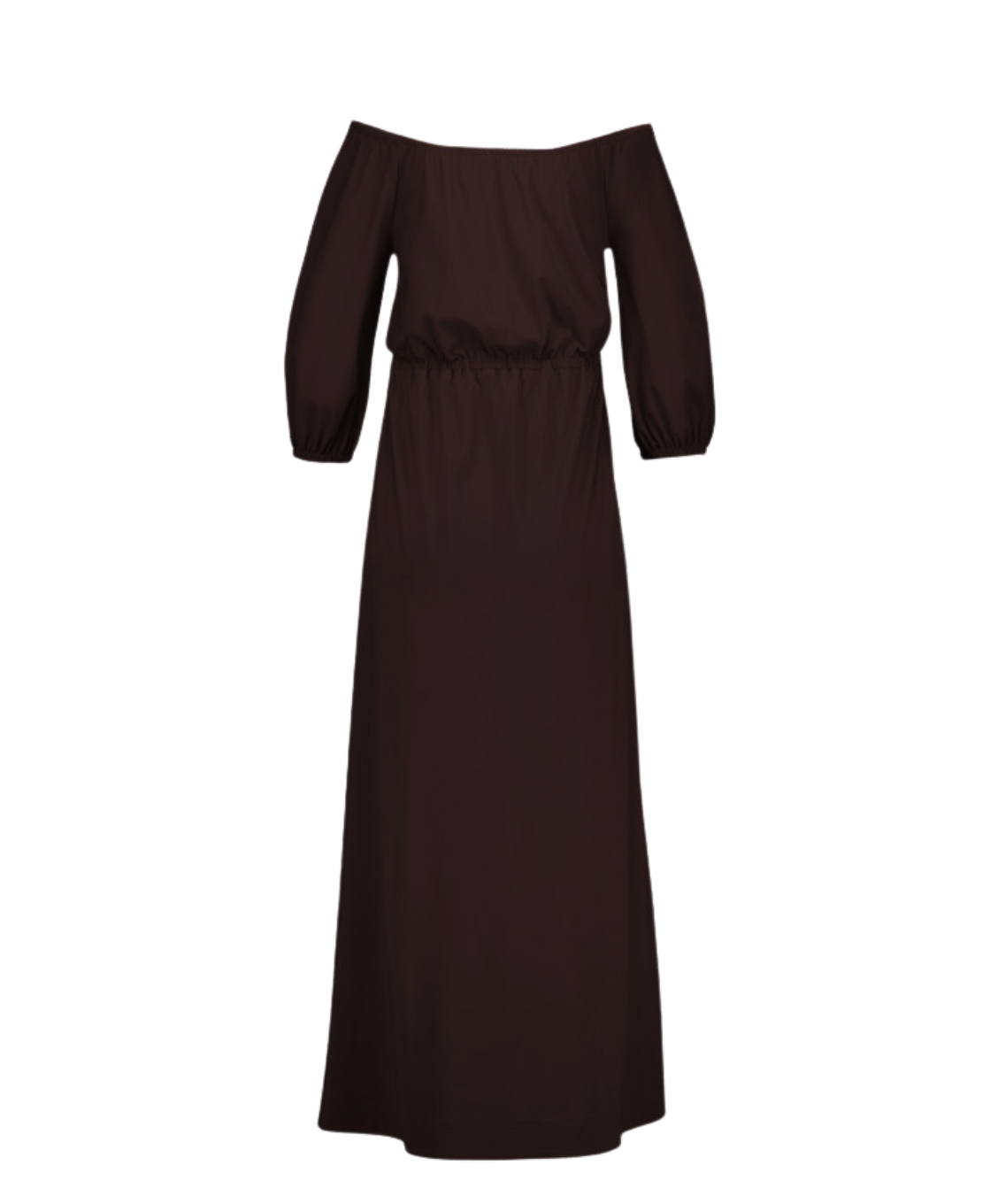 De Saturday dress van Studio Anneloes is een vrouwelijke midi jurk in de kleur Espresso. De soepele Medium Travelstof, elastische details en het off-the-shoulder model geven dit item een elegante en tegelijkertijd comfortabele uitstraling, perfect voor zowel casual als meer geklede momenten.