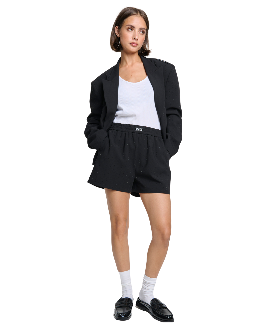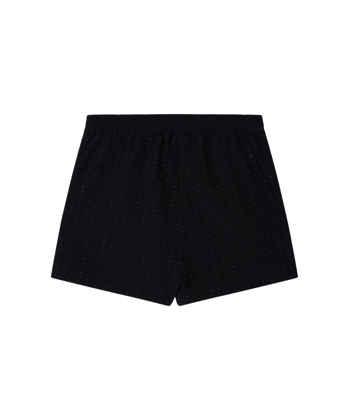 Deze elegante zwarte short combineert comfort met een vleugje glamour. Gemaakt van een stevige stofmix van polyester, viscose en elastaan, waardoor de short mooi in vorm blijft en prettig draagt. De elastische tailleband zorgt voor extra comfort, terwijl de steekzakken en subtiele steentjes een chique, feestelijke touch geven. Combineer met de bijpassende blazer voor de perfecte co-ord set. Of ga voor de combinatie met een leuke trui voor de meer casual look.