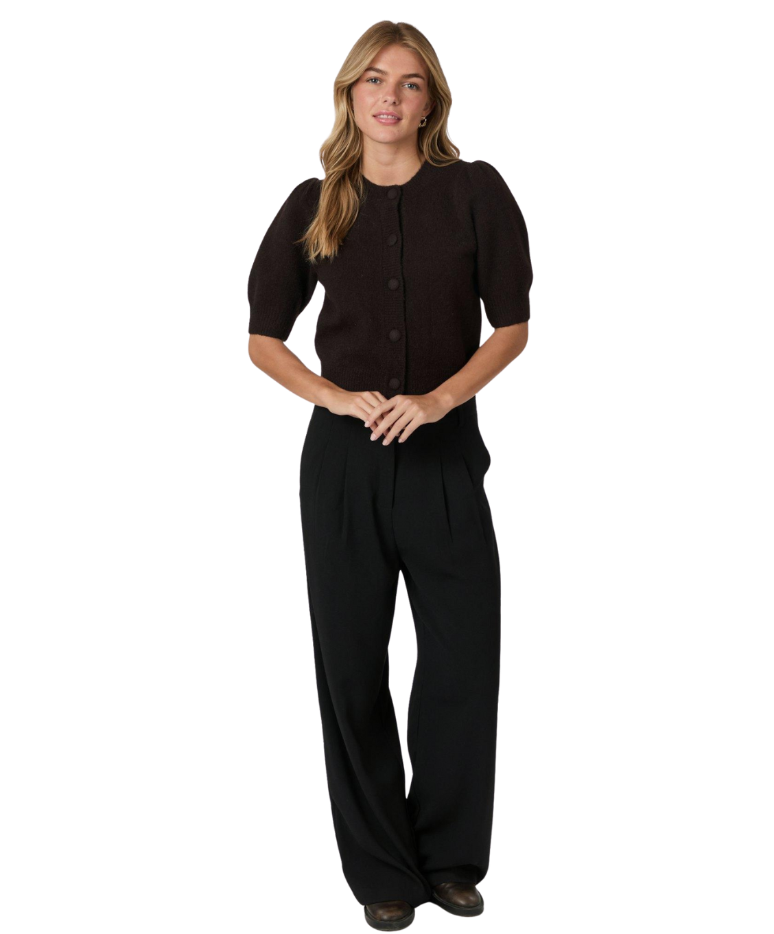 De Trudy cardigan is een stijlvolle cardigan in een zachte wolmix kwaliteit. Het model heeft een semi-aansluitende pasvorm en subtiele pofmouwen die zorgen voor een vrouwelijke uitstraling.De donkerbruine kleur geeft dit vest een warme en tijdloze look. Comfortabel, veelzijdig en een echte seizoensfavoriet.